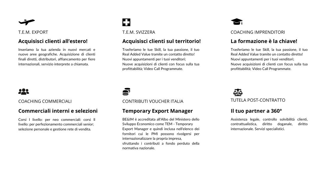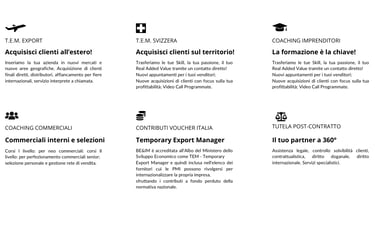 La sezione Temporary Export Manager è composta da professionisti introdotti in azienda per trasformare le tue ambizioni in realtà. Con competenze avanzate e un approccio strategico, apriamo nuovi mercati e acquisiamo nuovi clienti per la tua impresa, guidandoti verso un successo globale sostenibile attraverso i diversi passaggi.
